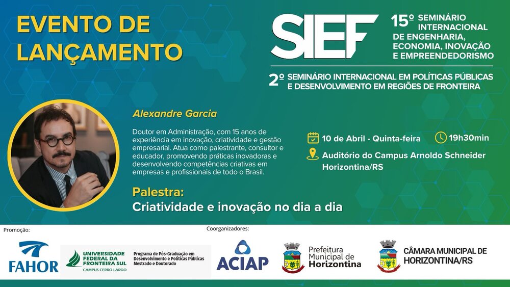 Criatividade e inovação no dia a dia. Esse é o tema da palestra de lançamento do SIEF 2025. Estamos na regressiva para o início deste grandeevento que completa 15 anos envolvendo estudantes e profissionais do sul do Brasil e da fronteira tri-nacional.