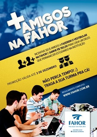 A FAHOR lançou a promoção "Mais amigos na FAHOR", que consiste na indicação, por parte de estudantes e egressos da FAHOR, aos seus amigos que ainda não estudam na instituição para que façam o Vestibular de Verão 2016 e se matriculem em um dos cursos de graduação da faculdade.
