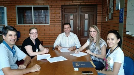A assinatura do convênio foi realizada com a presença do vice-diretor da FAHOR, Marcelo Blume, do coordenador da Incubadora, Luis Carlos Wachholz, e das sócias proprietárias da Ecol, Carla Inês Massmann, Odete Marques e Luciana Biondo