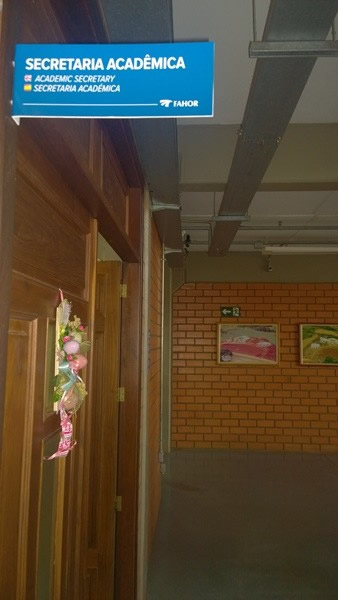 Além disso, possuem tradução para inglês e espanhol e algumas inclusive em alemão, facilitando o deslocamento e a comunicação visual com o público interno e com visitantes que chegam à FAHOR para conhecer a faculdade, participar de eventos, entre outros..