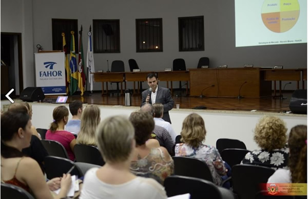 O professor Marcelo Blume, vice-diretor da FAHOR palestrou sobre "Estratégias de mercado para Micro e Pequenas empresas", e a professora Marlene Bieger abordou o tema "Administrando o Fluxo de Caixa Empresarial".
