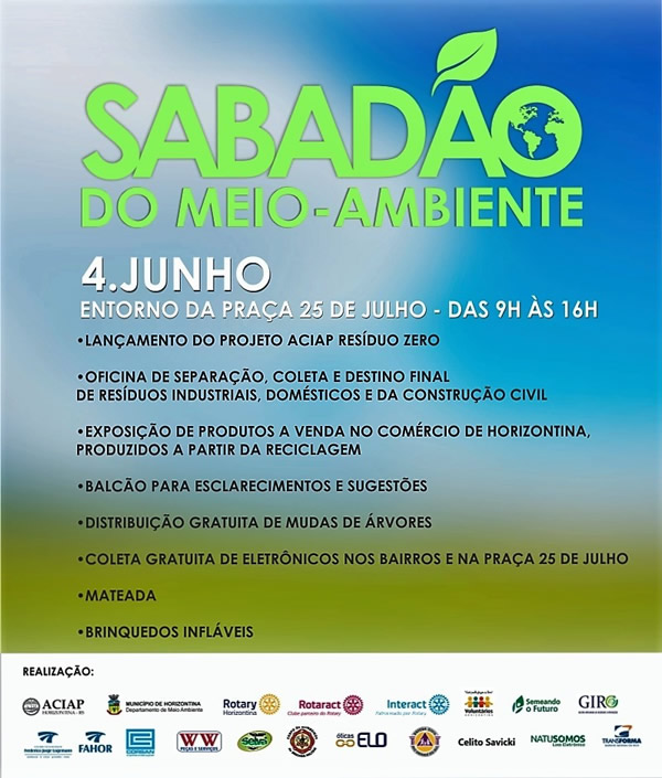 Amanhã será realizado o Sabadão do Meio Ambiente, na Praça em Horizontina. A FAHOR e o CFJL participarão do evento apresentando alguns projetos e ações voltados à área ambiental. O público poderá conhecer o reator que recicla plástico e transforma em óleo para sua reutilização na indústria, também o sistema de captação de água da chuva para diversas finalidades, os projetos de recuperação da mata ciliar e plantio de mudas de árvores nativas em toda a área do campus.