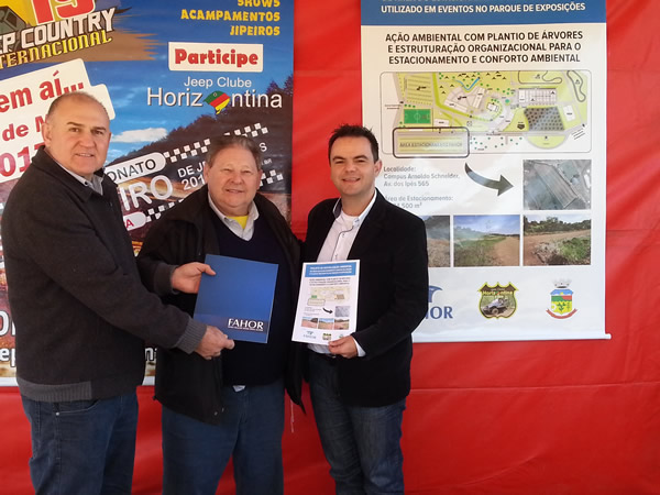 Aproveitando as atividades do Sabadão do Meio Ambiente, a FAHOR entregou ao Jeep Clube de Horizontina o projeto de revitalização de área do estacionamento do campus da FAHOR, que vem sendo utilizada pelos eventos no Parque de Exposições João de Oliveira Borges. O vice-diretor da FAHOR, professor Marcelo Blume entregou o projeto ao coordenador do Jeep Country Internacional, Elemar Beck, com presença também do prefeito de Horizontina, Nildo Hickmann.