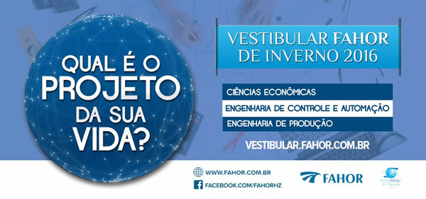 Esta é a última semana de inscrição para o Vestibular FAHOR de Inverno 2016. Os interessados em cursar Ciências Econômicas, Engenharia de Controle e Automação ou Engenharia de Produção devem se inscrever até sábado, dia 25, para participar do processo seletivo. A prova, dia 27, próxima segunda-feira, será somente uma redação às 19h30min, no campus da FAHOR.