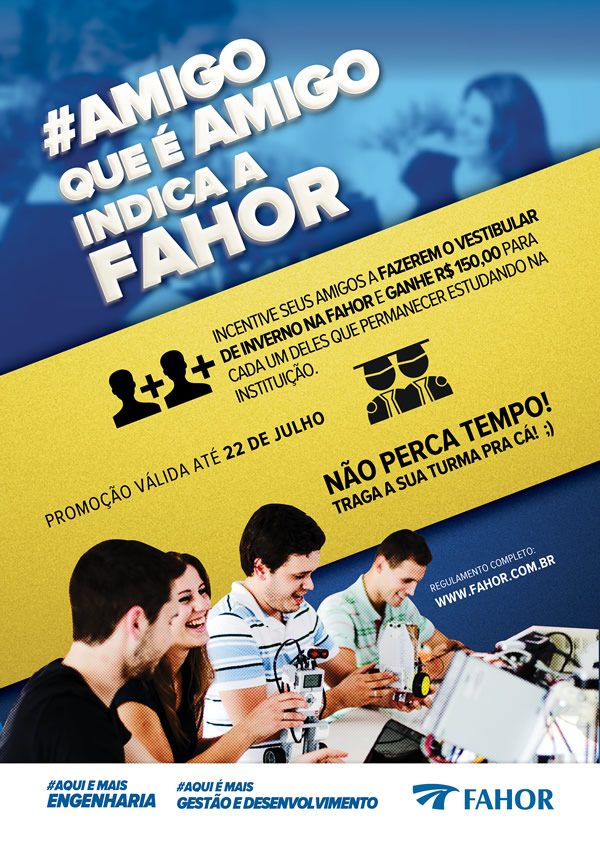 Poder ajudar seus amigos na formação profissional e receber premiação por esta ação é uma oportunidade que acadêmicos e egressos da FAHOR têm neste processo seletivo de Vestibular de Inverno 2016. A campanha "Amigo que é amigo indica a FAHOR" concede R$ 150,00 em créditos a cada indicação para seus amigos e colegas estudarem na FAHOR. O valor pode ser usado em desconto na mensalidade, em cursos de qualificação, de pós-graduação, e outros serviços. Saiba mais e participe!