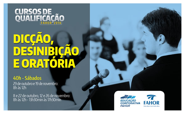 O curso de qualificação em Dicção, Desinibição e Oratória, que está sendo ofertado pela FAHOR, pode ser validado como disciplina eletiva ou ainda como ACG – Atividade Complementar de Graduação. Assim, além da oportunidade de aperfeiçoamento profissional os estudantes poderão completar seu currículo acadêmico com este curso. Os participantes aprenderão técnicas para desinibição e desbloqueios psicológicos para falar em público, postura, expressão corporal e facial, comunicação verbal e não verbal, conservação vocal, respiração e entonação da voz, eliminação de vícios de linguagem e dicção e uso de estratégias de oratória.