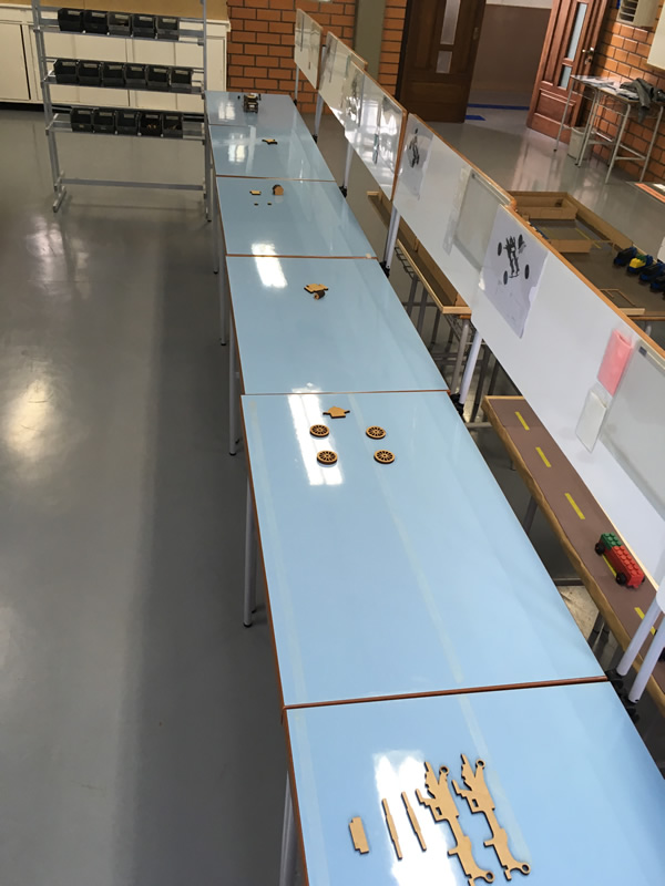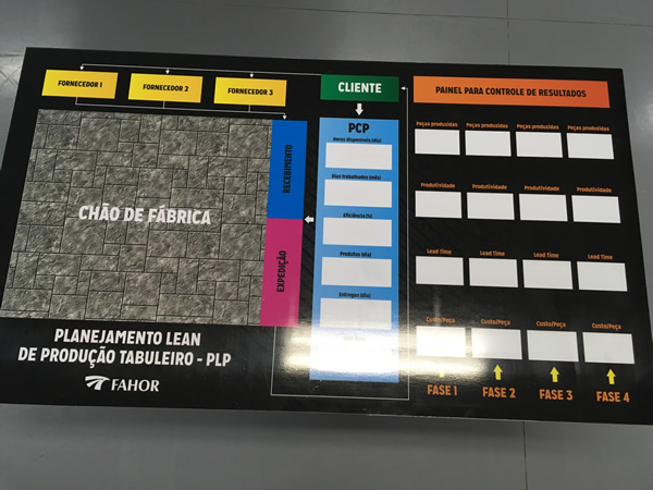 Tabuleiros de Jogo do Sistema Lean de Produção com os quais os alunos aprendem na prática as estratégias desse sistema, como planejar e produzir. De acordo com o professor Sirnei, neste jogo, cria-se um problema para resolução com aplicação de toda teoria aprendida, para identificar as possibilidades de ganho. Quadros e cartões visuais do sistema Kanban, que ajudam os trabalhadores a planejarem a produção na indústria e a controlar o estoque. Assim, conforme a quantidade de cartões disponíveis nos quadros são tomadas decisões, priorizando o que é mais importante, realizando setup de máquinas e até mesmo as paradas para manutenção.