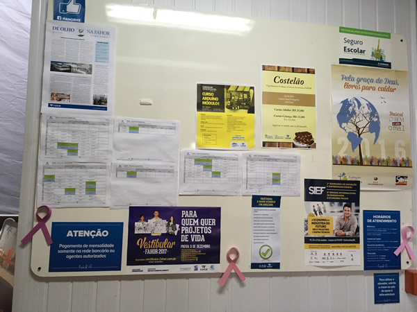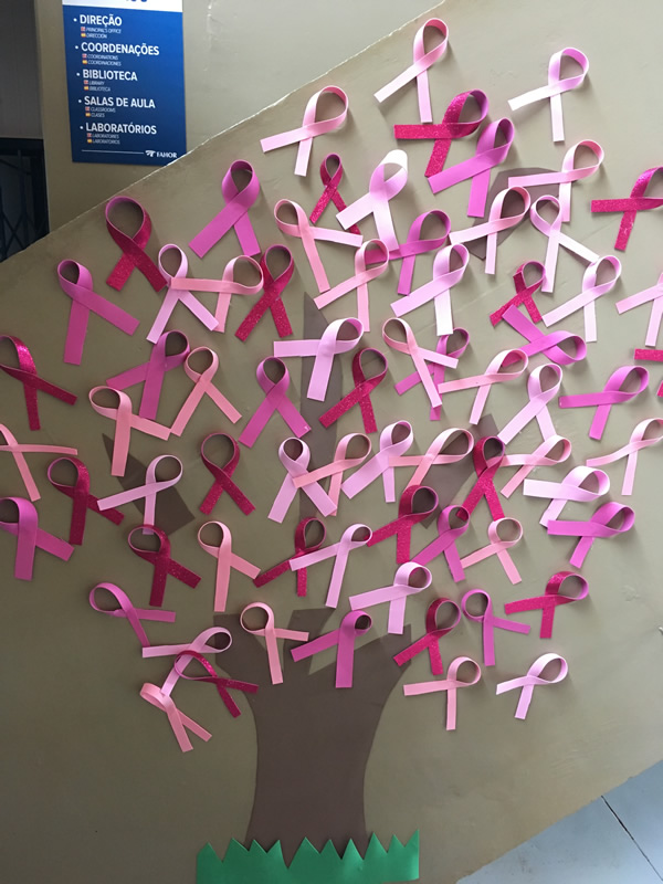 A FAHOR já se vestiu de rosa para apoiar o Outubro Rosa: portas do administrativo, e das entradas dos prédios de salas de aulas já foram decoradas com topes na cor rosa. No hall do CT foram decoradas as plantas ornamentais com tecidos e flores de papel de seda. Já na escada que leva ao segundo andar do CT uma árvore com laços que simbolizam a campanha foi formada.