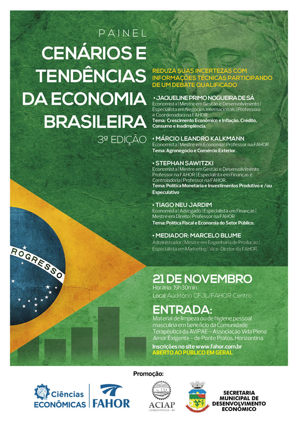 Será na próxima segunda-feira, dia 21, a 3ª edição do Painel Cenários e Tendências do atual contexto Econômico do Brasil, realizado pela FAHOR, por meio do curso de Ciências Econômicas, ACIAP e Administração Municipal de Horizontina, por meio da Secretaria de Desenvolvimento Econômico, com apoio do Núcleo de Apoio Empresarial, Ambiente Empreendedor e Tendências Empresa Junior.