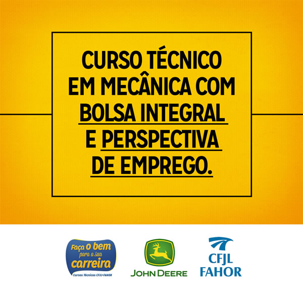 Em mais uma parceria do CFJL/FAHOR com uma grande empresa, mais pessoas serão qualificadas e terão oportunidade de saírem com um emprego garantido. Dessa vez, a parceria é com a John Deere e o curso em questão é o Técnico em Mecânica que será ofertado com bolsa integral. Os alunos que obtiverem bom desempenho, frequência e aprovação no curso terão perspectiva de emprego na empresa.