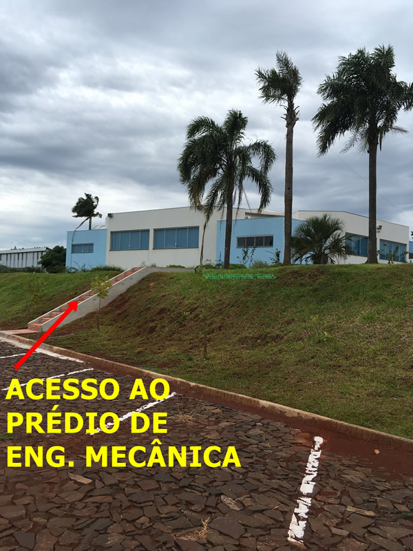 Já o acesso ao prédio da Engenharia Mecânica dá-se pelas escadarias novas estruturadas através do antigo estacionamento atrás do mesmo. Segue fotos com setas para melhor esclarecimento.
