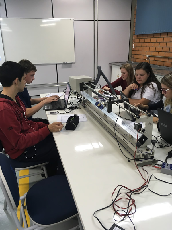 Para a realização do experimento foi utilizado um conjunto didático chamado de trilho de ar, que é capaz de simular diversos tipos de movimentos e sistemas utilizados no estudo da mecânica. Com isso, é possível representar e discutir os conceitos mais importantes da Física 1 em sala de aula.