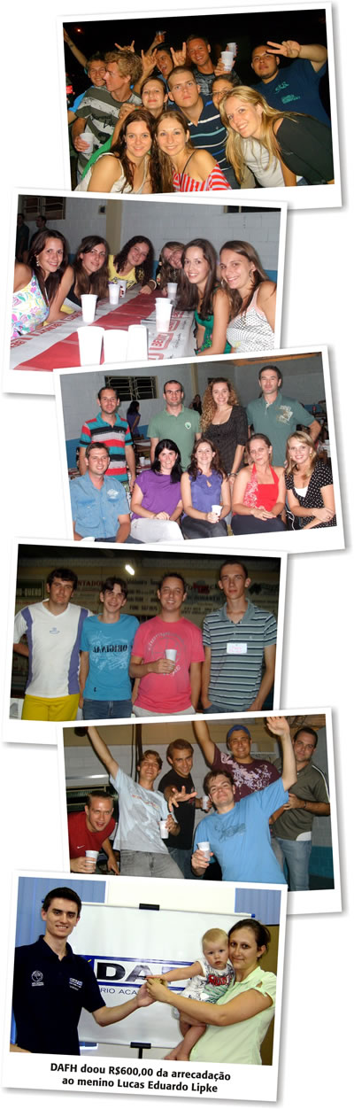 Mas além destas atividades, este momento também teve caráter solidário/filantrópico. Através de iniciativa do DAFH parte dos valores arrecadados no evento, R$600,00, estão sendo destinados ao menino Lucas Eduardo Lipke, que necessita de uma cirurgia do coração, que deve ser realizada no exterior e tem um custo de R$150.000,00, cabendo a todos nós colaborarmos.