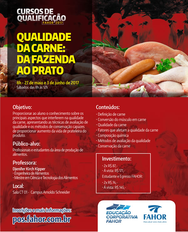 A FAHOR, por meio do seu novo Curso de Graduação em Engenharia de Alimentos, busca proporcionar aos seus alunos e a sociedade os principais conhecimentos relativos aos processos de fabricação, manuseio, seleção e controle da qualidade dos alimentos que vão à mesa dos consumidores todos os dias. Antes mesmo de ser deflagrada a "Operação Carne Fraca", hoje conhecida mundialmente pelas denúncias de adulteração de carnes nos maiores frigoríficos do Brasil, a Faculdade lançou o Curso de Qualificação "Qualidade da carne: da fazenda ao prato". As inscrições vão até o dia 25 de maio.