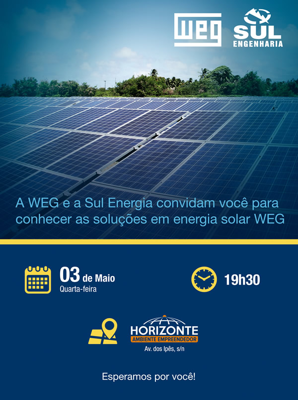 Na próxima quarta-feira, 3, será realizada uma palestra com o Engenheiro Elétrico Thomás Manhago Tomé. O evento é uma parceria entre FAHOR, WEG e Sul Energia e será realizado no Horizonte Ambiente Empreendedor, localizado na Avenida dos Ipês, em Horizontina, às 19h30min. O palestrante irá falar sobre as soluções em energia solar da WEG.