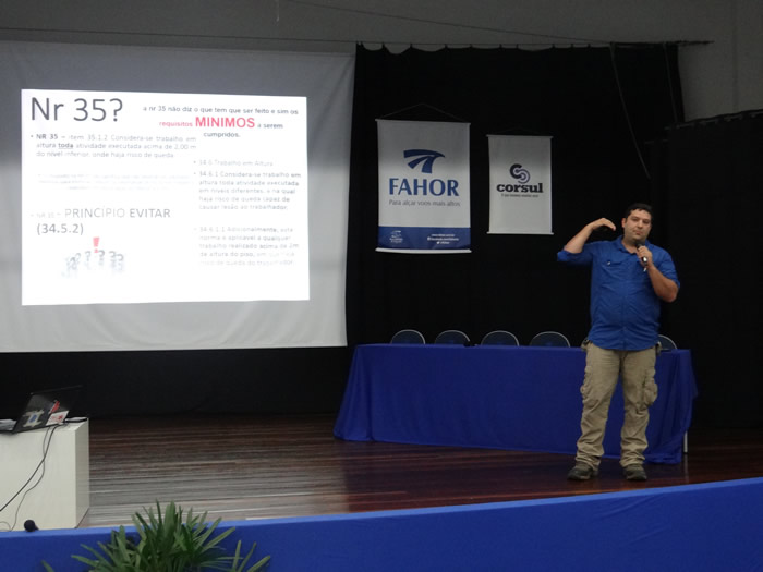 O espeleologista e diretor técnico do Centro de Treinamento Estadual Resgate Médico, Fábio Bortolotti, trouxe informações a respeito da aplicação da NR 35, no que diz respeito ao uso correto dos equipamentos de segurança, pelas empresas e trabalhadores que trabalham em altura.