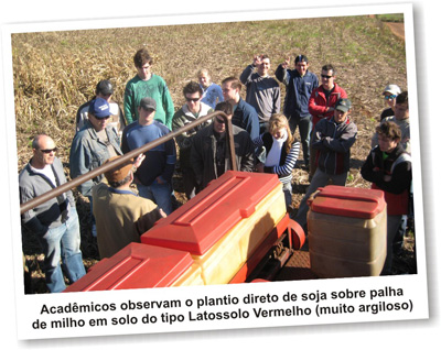 Na oportunidade, os acadêmicos visualizaram as características dos solos predominantes no município, assim como a relação das máquinas com o solo, como a semeadora de plantio direto de trigo sobre a palha de soja e a semeadora de soja sobre a palha de milho.