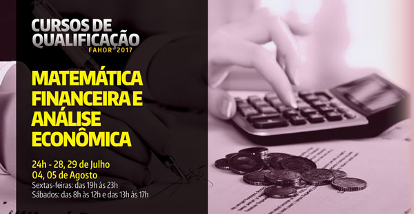A qualificação "Matemática Financeira e Análise Econômica" também possui carga horária de 24 horas, e, suas aulas serão ministradas nos dias 28 e 29 de julho e 04 e 05 de agosto, na Sala CT01 - Campus Arnoldo Schneider. Este curso visa capacitar os alunos a operarem calculadora HP, entender a matemática financeira e o fluxo, análise e controle de caixa. O público a que se destina este curso são os estudantes e egressos dos cursos de engenharia e economia, profissionais de instituições bancárias, empresários e público em geral que tenha interesse na formação. O professor será o Bacharel em Administração e Mestre em Engenharia de Produção, Anderson Luis Walker Amorin.