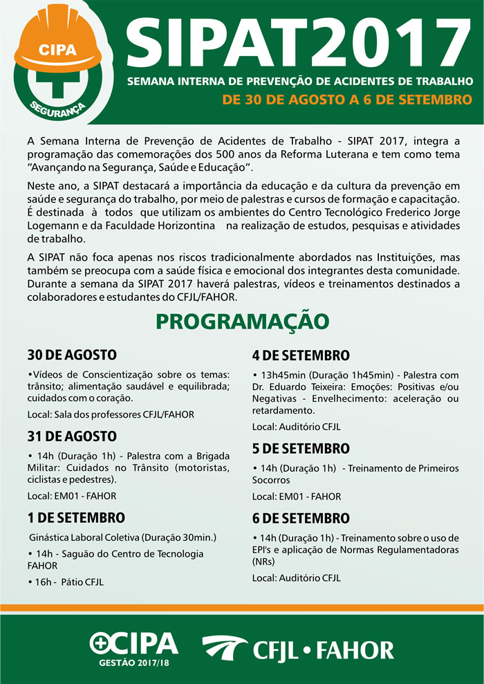 E são esses assuntos que estão na programação da Semana Interna de Prevenção de Acidentes de Trabalho, que tem como tema em 2017: “Avançando na Segurança, Saúde e Educação”. O assunto integra a programação das comemorações dos 500 anos da Reforma Luterana e neste ano a SIPAT destacará a importância da educação e da cultura da prevenção em saúde e segurança do trabalho, a partir de palestras e cursos de formação e capacitação. As duas Comissões (CIPA), do CFJL e da FAHOR, trabalham juntas nesta tarefa de educar e cuidar. O presidente da CIPA do CFJL é o vice-diretor do noturno do CFJL, Vilson Hirt e a presidente da CIPA da FAHOR é engenheira química e professora, Darciane Kerkhoff.
