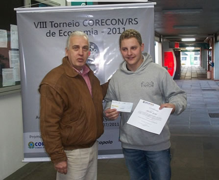 O Corecon-RS distribuiu a premiação de R$ 3.000,00 aos três primeiros colocados no torneio. Felipe Kuhn é aluno do sexto semestre do curso de Ciências Econômicas da Fahor.