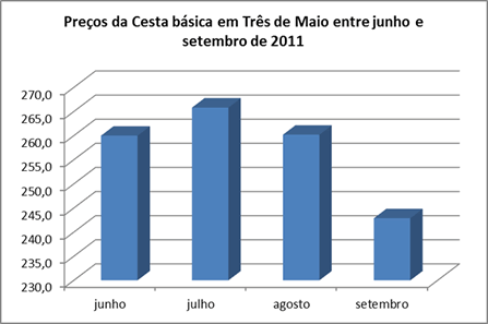 Também em Três de Maio observou-se comportamento similar ao observado nos outros municípios pesquisados pelo curso, a queda nos preços médios em Setembro. No caso deste município este mês apresenta o menor valor necessário para a aquisição da cesta básica, o que certamente agrada aos consumidores.