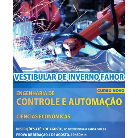 Com a publicação da autorização do MEC para funcionamento do novo curso, a FAHOR abriu processo seletivo oferecendo 50 vagas para Engenharia de Controle e Automação. O vestibular será dia 4 de agosto, com prova de redação e com possibilidades de ingresso extravestibular, como para profissionais já diplomados, aproveitamento da nota da redação do ENEM, e vestibular agendado.