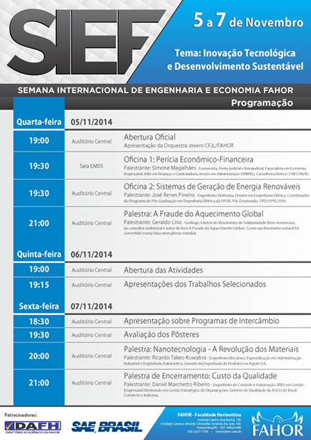 A FAHOR realizará a quarta edição da Semana Internacional de Engenharia e Economia de 5 a 7 de novembro com palestrantes de renome nacional e internacional. Todas as atividades da programação serão embasadas no tema "Inovação tecnológica e o desenvolvimento sustentável".