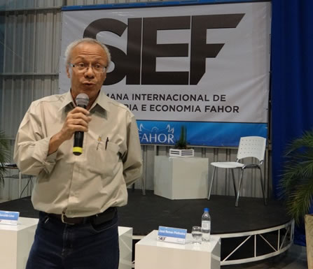 A FAHOR convidou o geólogo Geraldo Lino para participar da 4ª SIEF e abordar o tema de seu livro: "A fraude do aquecimento global: como um fenômeno natural foi convertido numa falsa emergência mundial". Lino veio do Rio de Janeiro especialmente para ministrar a palestra aos acadêmicos da FAHOR, nesta quarta-feira, dia 5, debatendo sobre este tema polêmico, apresentando dados e gráficos que comprovam sua tese.