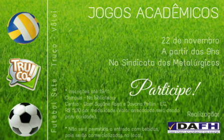 O Diretório Acadêmico da FAHOR promove neste sábado, dia 22, os Jogos Acadêmicos nas modalidades de futebol sete masculino, voleibol dupla misto, truco dupla misto. Os jogos serão na sede do Sindicato dos Metalúrgicos e inicia às 9 horas da manhã com voleibol e truco e à tarde, a partir das 13 horas iniciam as partidas de futebol.