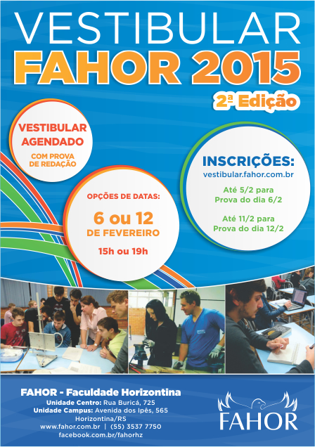 A FAHOR realizará a 2ª edição do Vestibular 2015 de forma agendada, oferecendo mais uma oportunidade para o ingresso na faculdade. São oferecidas vagas para os cursos de Ciências Econômicas, Engenharia de Produção e Engenharia de Controle e Automação.  A prova será uma redação e poderá ser feita em duas datas e em dois horários a serem agendados.