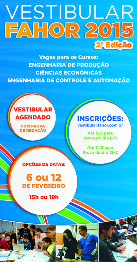 Estão abertas as inscrições para o Vestibular FAHOR 2015 – 2ª edição. Neste processo seletivo, a FAHOR oferece oportunidades de ingresso com duas datas de prova: a primeira foi realizada dia 6 (veja a lista dos aprovados aqui) e a segunda será nesta quinta-feira, 12 de fevereiro. Os candidatos interessados nas vagas para os cursos de Ciências Econômicas, Engenharia de Produção e Engenharia de Controle e Automação podem se inscrever gratuitamente até o dia 11 pelo site vestibular.fahor.com.br e escolher o horário da prova, que é uma redação: 15h ou 19h.