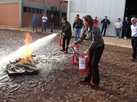 Macke também abordoou sobre os tipos de extintores que podem ser usados nas diversas situações e conforme a classe do fogo. Após, os participantes tiveram um treinamento para saber usar corretamente os extintores.