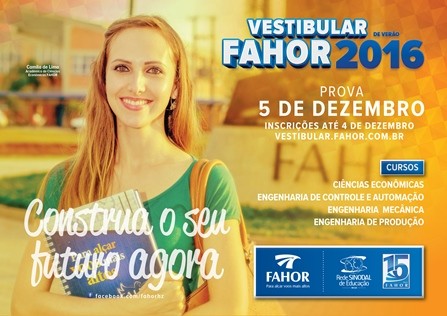 O Vestibular de Verão FAHOR 2016 será realizado dia 5 de dezembro, às 14 horas. O lançamento para imprensa e comunidade em geral será dia 5 de outubro, às 16 horas, no auditório do campus FAHOR.